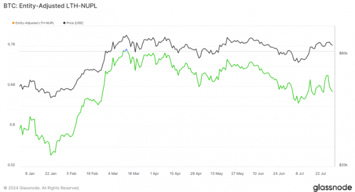 2024年,LTH-NUPL持續(xù)保持在0.5以上,表明長期持有者對市場上升趨勢抱有強(qiáng)烈信心。該指數(shù)經(jīng)歷了5月11日至13日的貪婪階段,隨著Bitcoin創(chuàng)下新的歷史新高,表現(xiàn)出短暫的興奮。自7月以來,LTH-NUPL一直呈上升趨勢,波動(dòng)較大,7月27日達(dá)到0.7,7月31日小幅下降至0.66。
