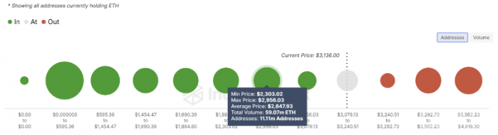 根據IntoTheBlock的數據,大約369萬個地址在3000美元的價格點持有124萬枚ETH,這一價位是ETH的直接心理支撐。與2700美元的關鍵支撐位相比,這一支撐相對較弱。在2700美元范圍內,1111萬個地址持有高達5907萬枚ETH,平均價格為2647美元。