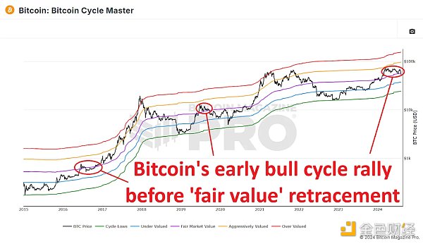盡管最近出現(xiàn)了下滑,但仍有幾個(gè)理由讓人對(duì)Bitcoin的長(zhǎng)期前景保持樂觀態(tài)度。最近的價(jià)格波動(dòng)可以被視為更廣泛的牛市周期內(nèi)的自然修正。當(dāng)我們拉遠(yuǎn)視角看Bitcoin的歷史表現(xiàn)時(shí),這樣的修正并不罕見。在先前的周期中,Bitcoin經(jīng)常在恢復(fù)向上軌跡之前下跌至其周期主導(dǎo)公平市值以下。