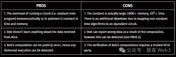 在現實中,FHE外包模式通常被視作TEE等安全執行環境的替代方案,FHE的安全性基于密碼學算法,而不依賴于硬件等實體設備。因此,FHE完全不受被動側信道攻擊或云端服務器被攻擊的影響。想象一下,當某人需要外包出去一些計算任務,但數據非常敏感,他可能不愿意使用搭建在AWS上的虛擬機(VM),因為這類基于云端的服務器背后往往存在更高級的控制人。他也可能對SGX或TEE這類東西猶豫不決,因為運行TEE的主機可以監控該計算任務在執行時產生的功耗或運行時間等,可能通過這些數據來推斷出一些信息。