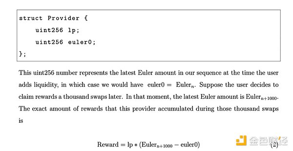 上圖中公式(2)這種方法假設LP余額在整個期間內保持不變。因此,無論何時提供者采取任何行動,例如添加/移除流動性,變量euler0都將刷新以反映序列中的最新Euler金額。此措施可防止流動性提供者操縱自己的獎勵份額。因此,建議流動性提供者在調整LP余額之前始終索取獎勵。LPTokens不可轉讓,除非被銷毀或從流動性中添加/移除。