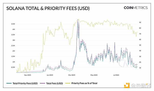 受整體市場(chǎng)和memecoin飆升的推動(dòng),Solana的總費(fèi)用在3月份達(dá)到了450萬(wàn)美元的峰值。此時(shí),優(yōu)先費(fèi)用占總費(fèi)用的95%(自8月以來(lái),這一數(shù)字一直保持在80%左右),代表著對(duì)交易納入的高需求。然而,活動(dòng)已顯著減少,目前總費(fèi)用為73.2萬(wàn)美元,優(yōu)先費(fèi)用為53.3萬(wàn)美元。采用和使用特征