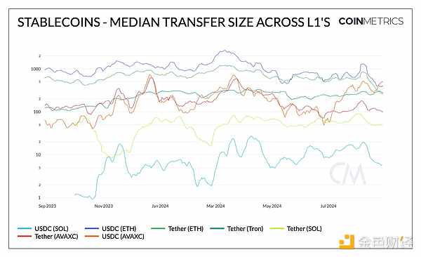 這一趨勢(shì)也反映在上圖中,該圖顯示了各主要穩(wěn)定幣(USDC和USDT)在第1層上的中位轉(zhuǎn)賬規(guī)模。Ethereum上的USDC和USDT通常都顯示出較高的中位轉(zhuǎn)賬規(guī)模——盡管最近分別降至400美元和267美元——這得益于Ethereum主網(wǎng)費(fèi)用的降低。Tron上的Tether一直保持在270美元的典型規(guī)模,而Solana的穩(wěn)定幣轉(zhuǎn)賬價(jià)值最低(USDC為7美元)和(USDT為50美元)。