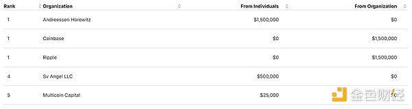 機(jī)構(gòu)方面,大部分捐款來(lái)自Coinbase、Ripple和JumpCrypto這三個(gè)Crypto交易平臺(tái),分別投入4650萬(wàn)美元、4650萬(wàn)美元和1500萬(wàn)美元,總額約為1.08億美元。A16Z也投入了4520萬(wàn)美元。