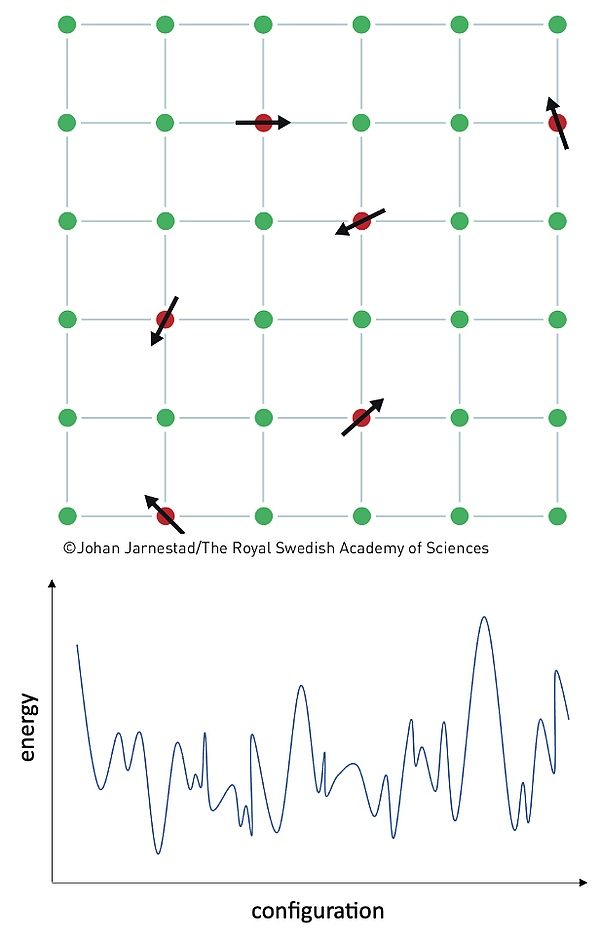 這張圖上方顯示了一個“自旋玻璃”,它內(nèi)部的無序性構(gòu)成了一種穩(wěn)態(tài),產(chǎn)生了下方所示的復(fù)雜的“能量地形”。