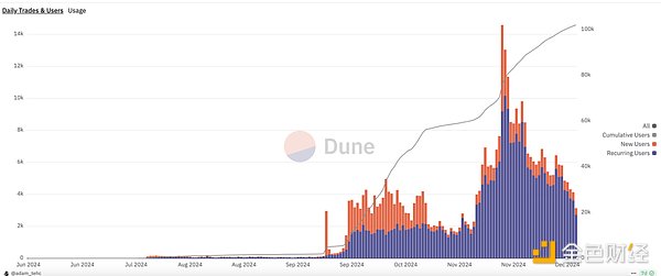 在這期間,針對Memecoin交易,工具從移動端向網頁端進行拓展,針對不同的細分需求,既有多鏈兼容的專業交易網站,比如gmgn.ai、Bullx、Photon,也有方便快捷的TGbot比如BananaGun、Tojan、Bonkbot等。這些專門針對Memecoin交易的服務工具借助Memecoin淘金熱,從全面向深度逐步過渡,關聯錢包分析、推特監控、安全檢測等工具日益完善,產品商業模式得到驗證。在這過程中,TGBot用戶數量也在不斷增加,日活用戶最高超14萬人,日均交易額最高近5億美元,雖然相對鏈上DEX還有很長一段路要走,但在Memecoin超級周期影響下,這個細分領域仍是藍海。