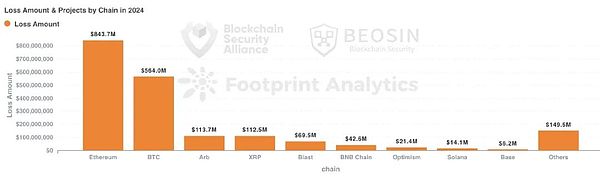 Bitcoin網(wǎng)絡(luò)損失排在第2位,單次安全事件損失達(dá)到了2.38億美元。第三位的是Arbitrum,總損失約為1.14億美元。
