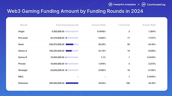AI還增強了Web3游戲的運營方面。該技術(shù)被用于自動化游戲測試流程和監(jiān)控鏈上交易以防范潛在欺詐或作弊行為,這在具有復(fù)雜經(jīng)濟系統(tǒng)的游戲中尤為重要。此外,AI算法正在幫助優(yōu)化游戲經(jīng)濟和Tokens模型,解決Web3游戲設(shè)計中的主要挑戰(zhàn)之一。投資格局年度融資事件概覽