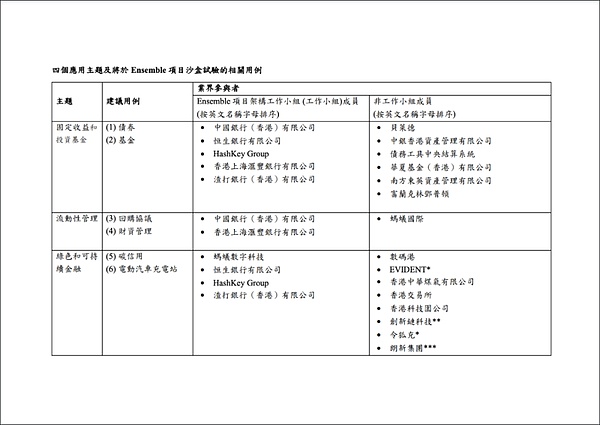 2024年8月28日,香港金管局舉行Ensemble項(xiàng)目沙盒啟動(dòng)儀式,宣布沙盒的首階段試驗(yàn)將涵蓋傳統(tǒng)金融資產(chǎn)和現(xiàn)實(shí)世界資產(chǎn)的Tokens化,并聚焦四大主題:固定收益和投資基金、流動(dòng)性管理、綠色和可持續(xù)金融,及貿(mào)易和供應(yīng)鏈融資。通過(guò)試驗(yàn),金管局將驗(yàn)證Tokens化資產(chǎn)、Tokens化存款和wCBDC之間的技術(shù)互通性,亦會(huì)讓業(yè)界參與者在實(shí)際業(yè)務(wù)場(chǎng)景中,對(duì)Tokens化資產(chǎn)交易進(jìn)行端對(duì)端測(cè)試。