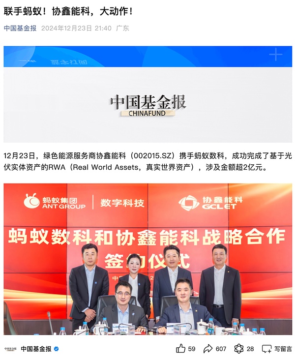 協(xié)鑫能科將位于湖北省、湖南省的82MW左右「鑫陽(yáng)光」戶用光伏作為RWA錨定資產(chǎn),通過(guò)Blockchain技術(shù)和IoT(物聯(lián)網(wǎng))技術(shù)融合,將戶用光伏項(xiàng)目的自身價(jià)值、運(yùn)營(yíng)、收益等數(shù)據(jù)打包存儲(chǔ)在Blockchain上形成數(shù)字通證。發(fā)行完成當(dāng)天,螞蟻數(shù)科與協(xié)鑫能科在蘇州簽署戰(zhàn)略合作協(xié)議。雙方將在分布式光伏電站、儲(chǔ)能電站、綜合能源服務(wù)等場(chǎng)景,開展新型電力系統(tǒng)建設(shè)、綠色金融、人工智能等方面全面合作,繼續(xù)為數(shù)字產(chǎn)業(yè)化和產(chǎn)業(yè)數(shù)字化探索融合路徑。