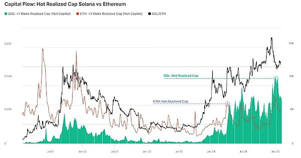 動態已實現市值是用來評估市場新進資金,新散戶需求的評估指標。下圖對比了Bitcoin,Ethereum,Solana的動態已實現市值情況: