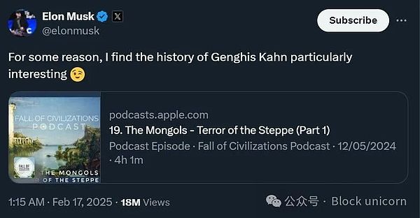 在你忍不住嘲笑馬斯克拼錯“Khan”之前,請記住,成吉思汗本人也無法拼寫自己的名字,因為他從未學(xué)過讀寫——這再次生動地提醒我們,書本知識和組織才能是兩件非常不同的事情。那些安慰自己說馬斯克永遠(yuǎn)無法征服他們的國家,因為他沒有世界上最高智商的進(jìn)步主義者,就像13世紀(jì)的學(xué)者告訴自己,他的國家永遠(yuǎn)不會被一個騎著小馬的文盲征服一樣愚蠢。