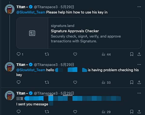 用戶在察覺異樣后并未配合,不過騙子沒有放棄,為了進一步施壓并取信于人,騙子建議用戶去咨詢慢霧安全團隊。一些警惕性不高的用戶,聽到對方愿意請安全公司驗證,可能會因此放松警惕,誤以為對方不是騙子。而騙子則往往賭定用戶不會真的去核實,甚至在行騙過程中直接 @SlowMist_Team,試圖利用安全公司為自己背書。