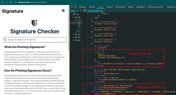 我們隨即對該工具 SignatureChecker(http://signature[.]land)進行分析,一打開便看到,該工具竟然支持用戶輸入私鑰來查詢。本來沒有風險的地址,在這個網(wǎng)頁輸入了私鑰,也得有風險了。