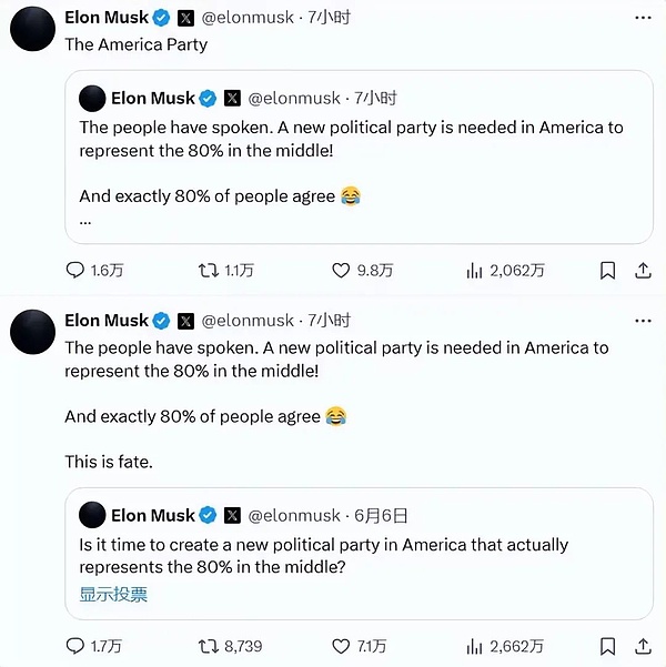 投票結(jié)果顯示,超563萬用戶參與,其中80.4%支持建立新黨,僅19.6%反對。馬斯克隨即轉(zhuǎn)發(fā)結(jié)果,宣布新政黨將命名為“美國黨”(TheAmericaParty),并稱:“人民已經(jīng)發(fā)出了聲音,這就是命運(yùn)!”