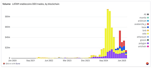 Dune的報告更多的是從鏈上的角度切入,難以覆蓋一些大體量的現(xiàn)實世界貿(mào)易場景需求(如進(jìn)出口貨物貿(mào)易,以及拉美大量的服務(wù)貿(mào)易)。但是我們依然可以透過其鏈上數(shù)據(jù)的分析,看到本土穩(wěn)定幣、鏈上支付協(xié)議、DEX在這個活躍市場的生態(tài)位,以及各自早期的發(fā)展軌跡。這對于穩(wěn)定幣支付的參與方頗有參考意義。