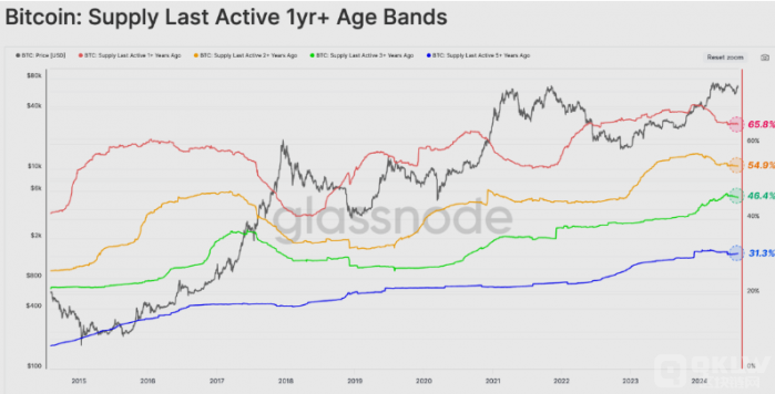 目前的Bitcoin分布顯示,投資者已經(jīng)停止獲利了結(jié),轉(zhuǎn)回“hodling”,即長期持有。這一趨勢表明,長期投資者在Bitcoin達(dá)到歷史高點之前會出售Tokens以滿足新的需求,而最近這種行為已經(jīng)放緩,表明投資者逐漸回歸持有狀態(tài)。