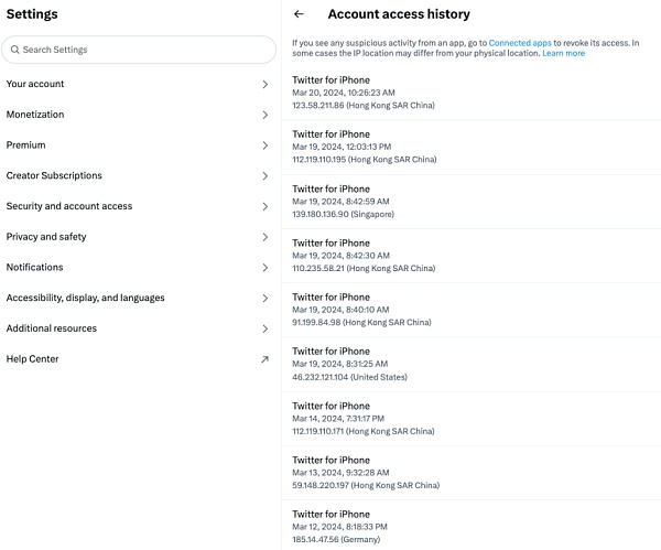 排查方法:Settings → Security and account access → Apps and sessions → Account access history
