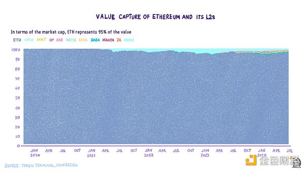 · 第一個(gè)途徑是看Ethereum是否會(huì)因?yàn)長2而損失收入。我們可以通過研究Ethereum生態(tài)收入中Ethereum的收入份額變化的來檢驗(yàn)這一點(diǎn)。下圖是關(guān)于Ethereum和五個(gè)領(lǐng)先L2的收入。Ethereum一直占收入流的90%以上。