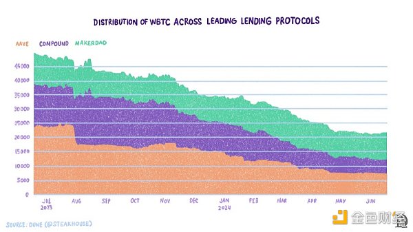 在這種設(shè)計(jì)模式下,一個(gè)集中的提供商將用戶在Bitcoin上的BTC鎖定在由托管人維護(hù)的Bitcoin地址上。BitGo的WBTC是使用最廣的BTC到其他鏈的橋接方式。使用WBTC橋接的BTC超過150k。WBTC的當(dāng)前分布如下所示。